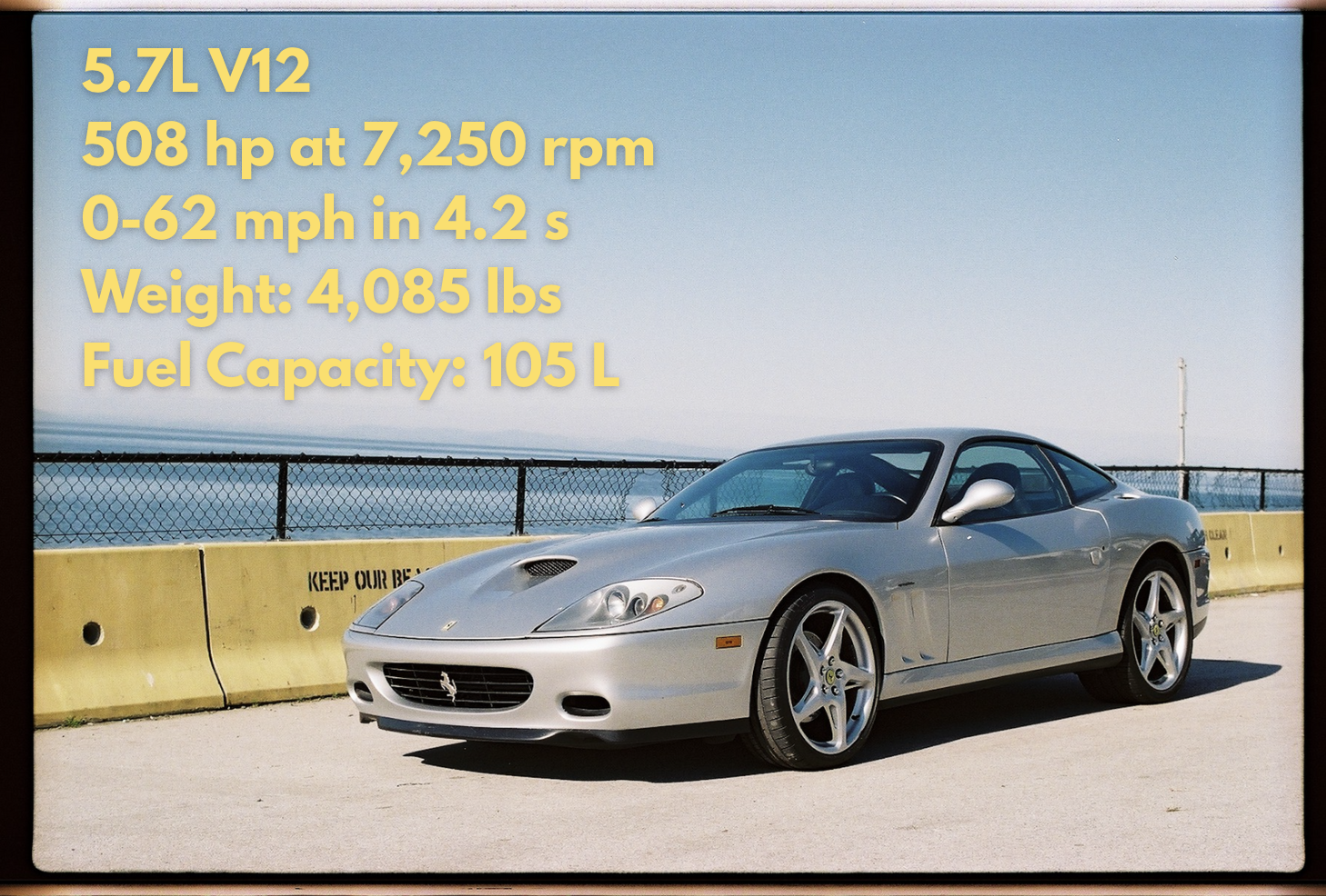 The 575 rides in the old grand touring style—there is body roll in the corners, and power builds progressively. With 508 hp, the V12 produces far more torque than the V8 variant, and a Superamerica tune should add 10–20 more. Power delivery is smooth and can be favourably compared to the next generation of Enzo-derived V12s, which have a more frenetic character.
