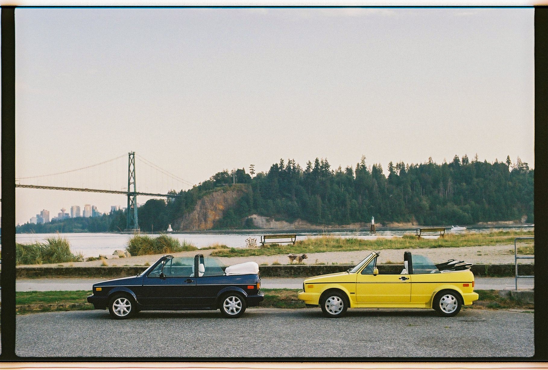 They are both MK1 Volkswagen Golf Cabriolets, made in Germany, have 5-speed manual transmissions, 1.8L engines, and a threatening 94 horsepower. You don’t get anywhere fast, but if you’re driving a Cabriolet, you have already arrived.