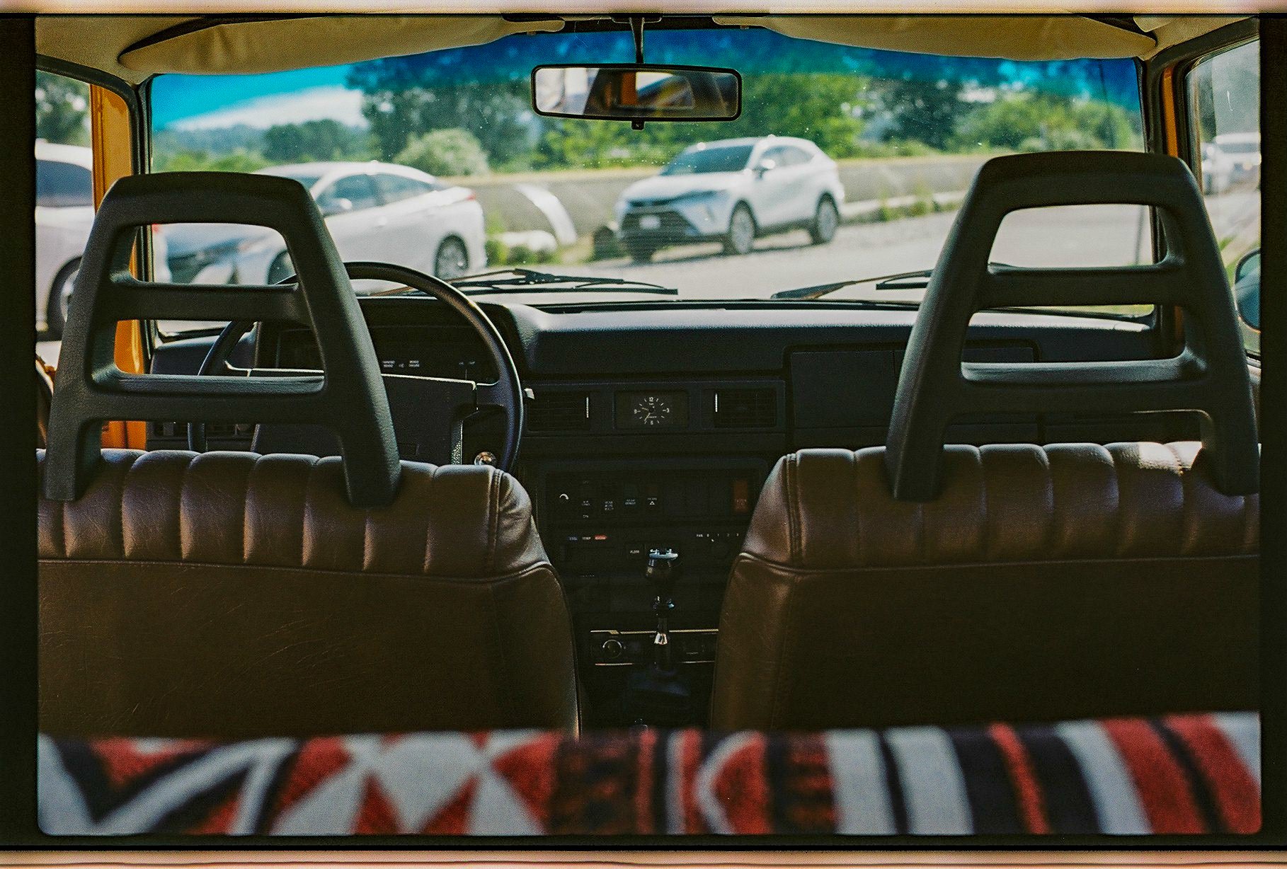 Scoops is basically top-of-the-line for the entire run of the MK1 Cabriolet, which stopped production in ‘93. He has an upgraded stereo, white leather interior, and every option other than A/C. He’s also equipped with a hydraulic top — which is currently not working. On the other hand, Banane (pronounced beh-nan) is a pretty standard Cabby apart from the white leather interior. We still love him though.